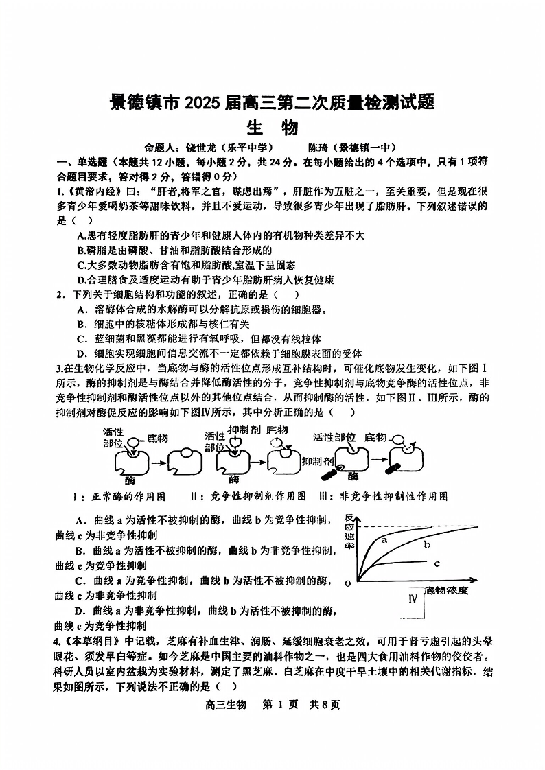 江西省景德镇市2025届高三上学期1月第二次质量检测(二模)生物+答案