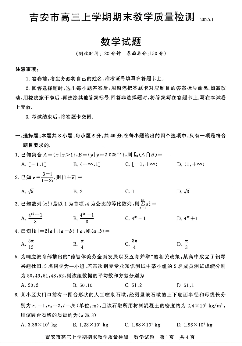 江西省吉安市2025届高三上学期1月期末教学质量检测数学