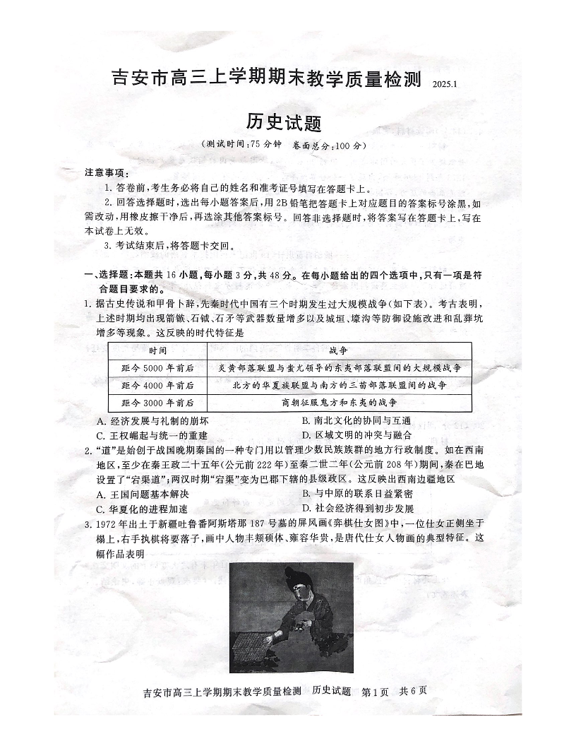江西省吉安市2025届高三上学期1月期末教学质量检测历史