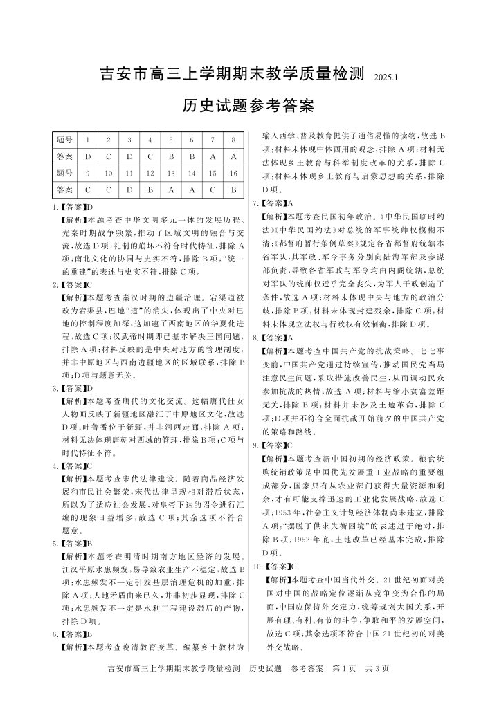 江西省吉安市2025届高三上学期1月期末教学质量检测历史答案