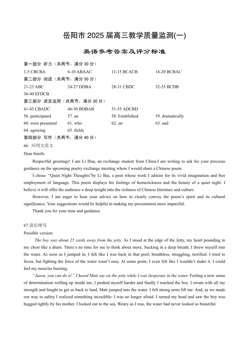 湖南省岳阳市2025届高三上学期教学质量监测(一)英语答案