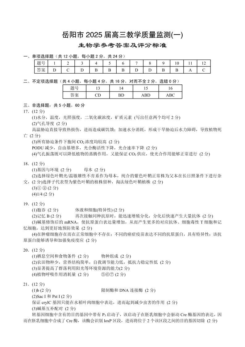 湖南省岳阳市2025届高三上学期教学质量监测(一)生物答案