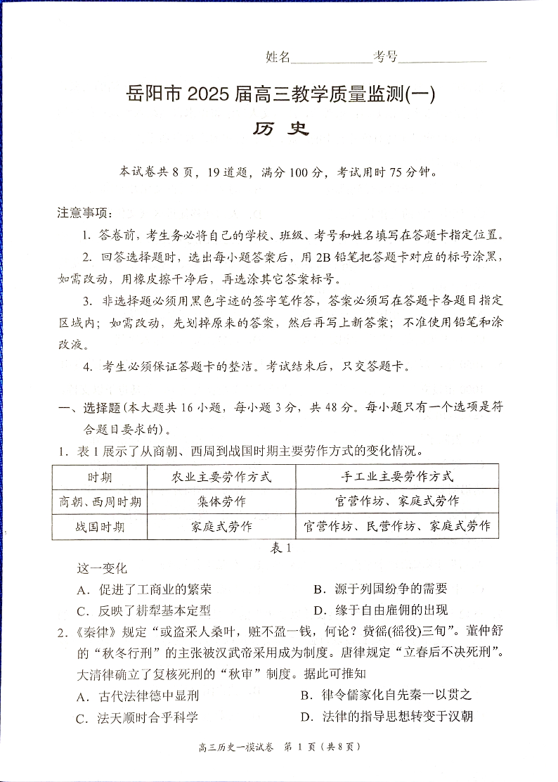 湖南省岳阳市2025届高三上学期教学质量监测(一)历史