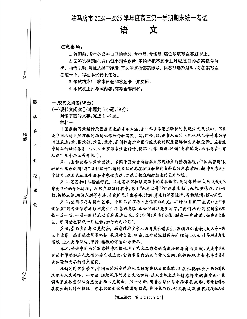 河南省驻马店市2024-2025学年1月高三第一学期期末统一考试语文