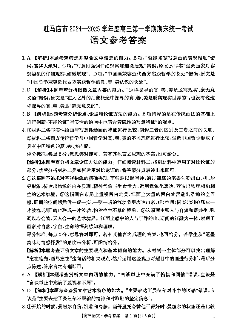河南省驻马店市2024-2025学年1月高三第一学期期末统一考试语文答案