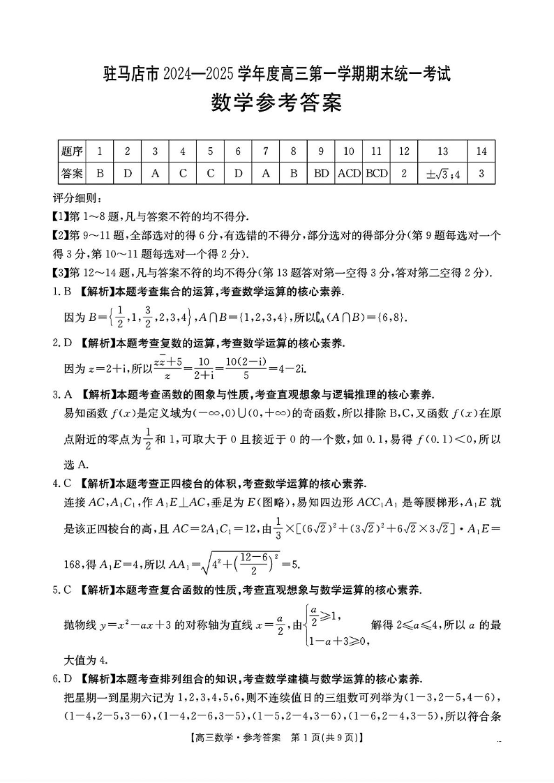 河南省驻马店市2024-2025学年1月高三第一学期期末统一考试数学答案