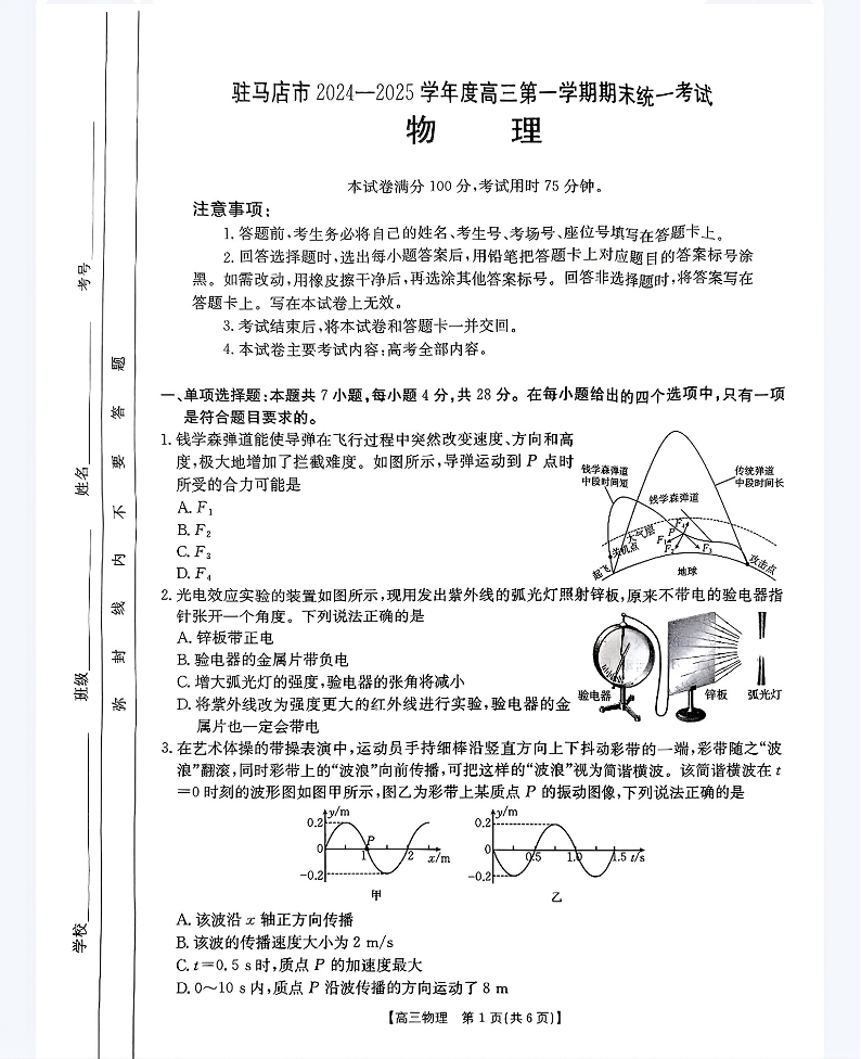 河南省驻马店市2024-2025学年1月高三第一学期期末统一考试物理