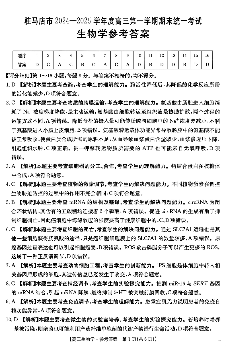 河南省驻马店市2024-2025学年1月高三第一学期期末统一考试生物答案