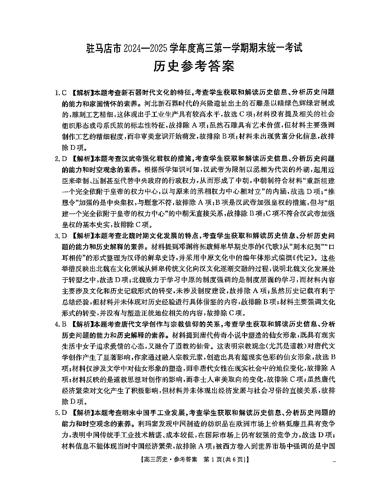 河南省驻马店市2024-2025学年1月高三第一学期期末统一考试历史答案