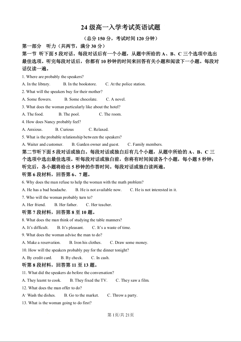 四川省仁寿第一中学校南校区24级高一入学考试英语(解析版)