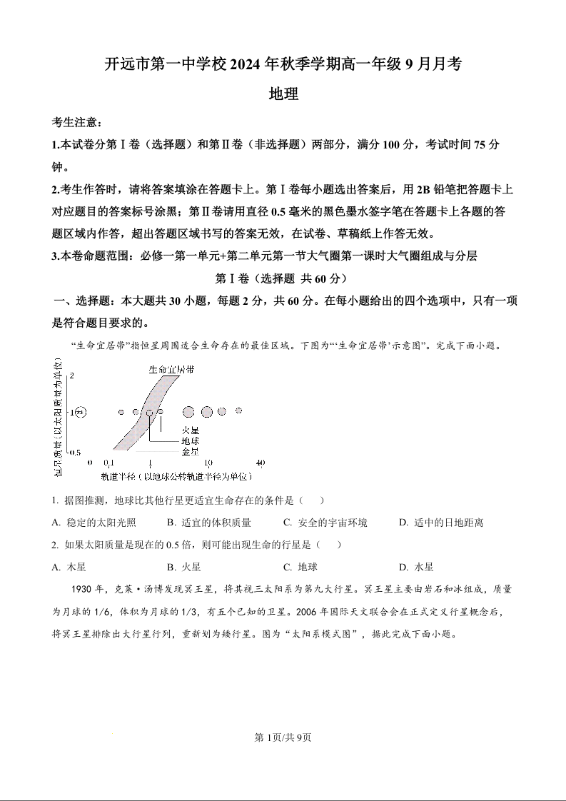 云南省红河州开远市第一中学校2024-2025学年秋季学期高二9月月考地理(原卷版)
