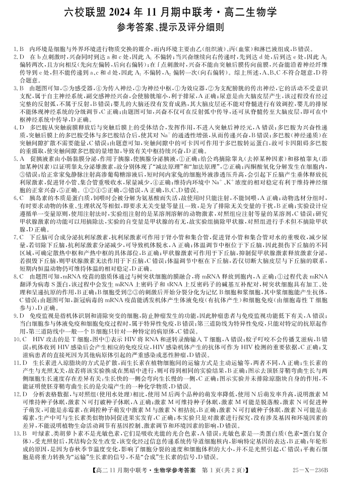 河北省保定市六校联盟2024年11月期中联考生物答案
