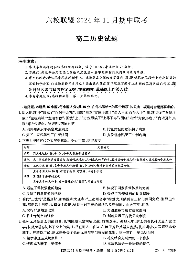 河北省保定市六校联盟2024年11月期中联考历史