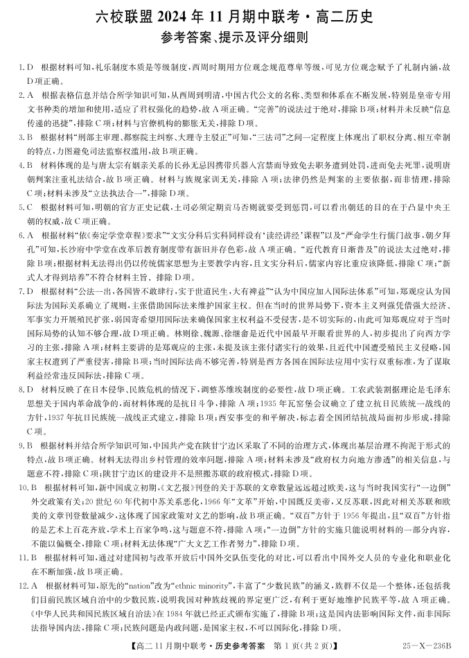 河北省保定市六校联盟2024年11月期中联考历史答案