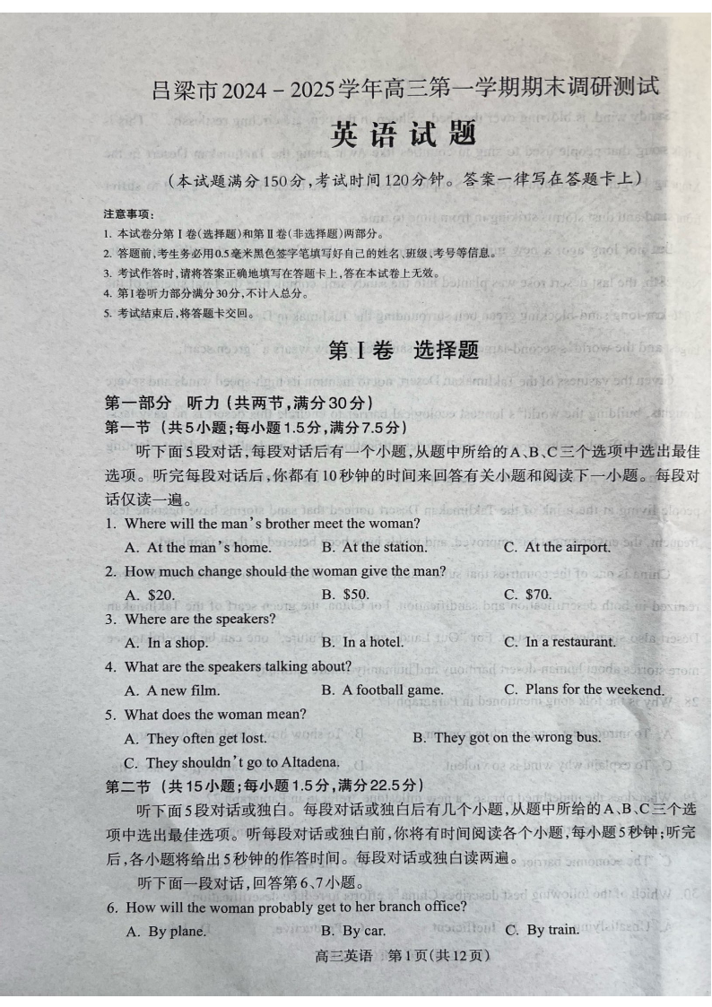 山西省吕梁市2025届高三上学期1月期末调研考试英语