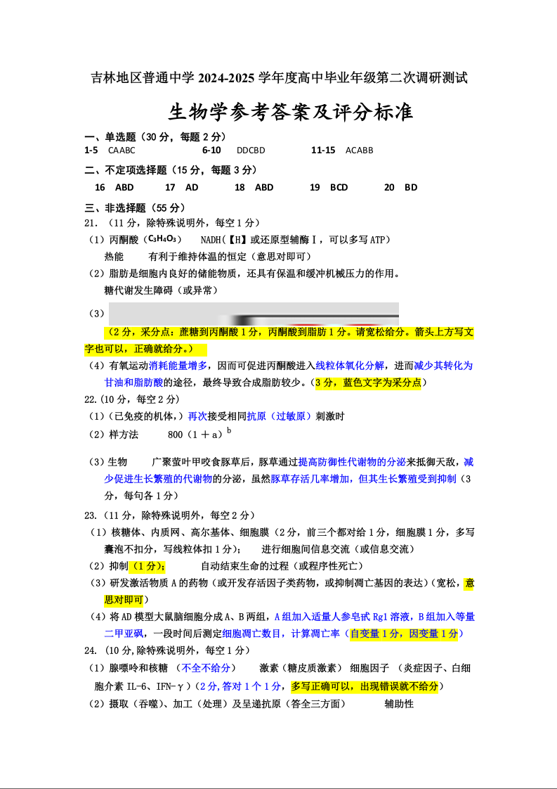 吉林省普通中学2024-2025学年上学期高三第二次调研测试生物答案