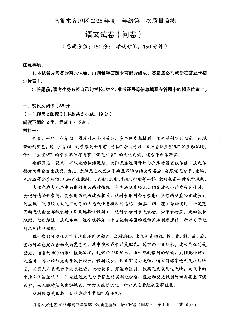 新疆乌鲁木齐地区2024-2025学年上学期高三第一次质量监测语文+答案