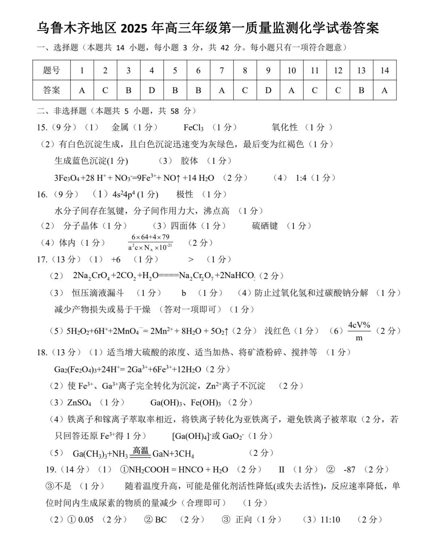 新疆乌鲁木齐地区2024-2025学年上学期高三第一次质量监测化学答案