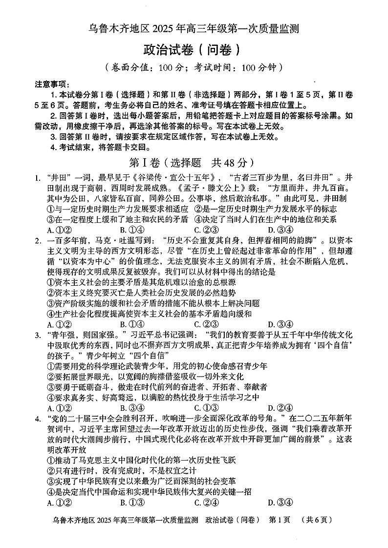 新疆乌鲁木齐地区2024-2025学年上学期高三第一次质量监测政治+答案