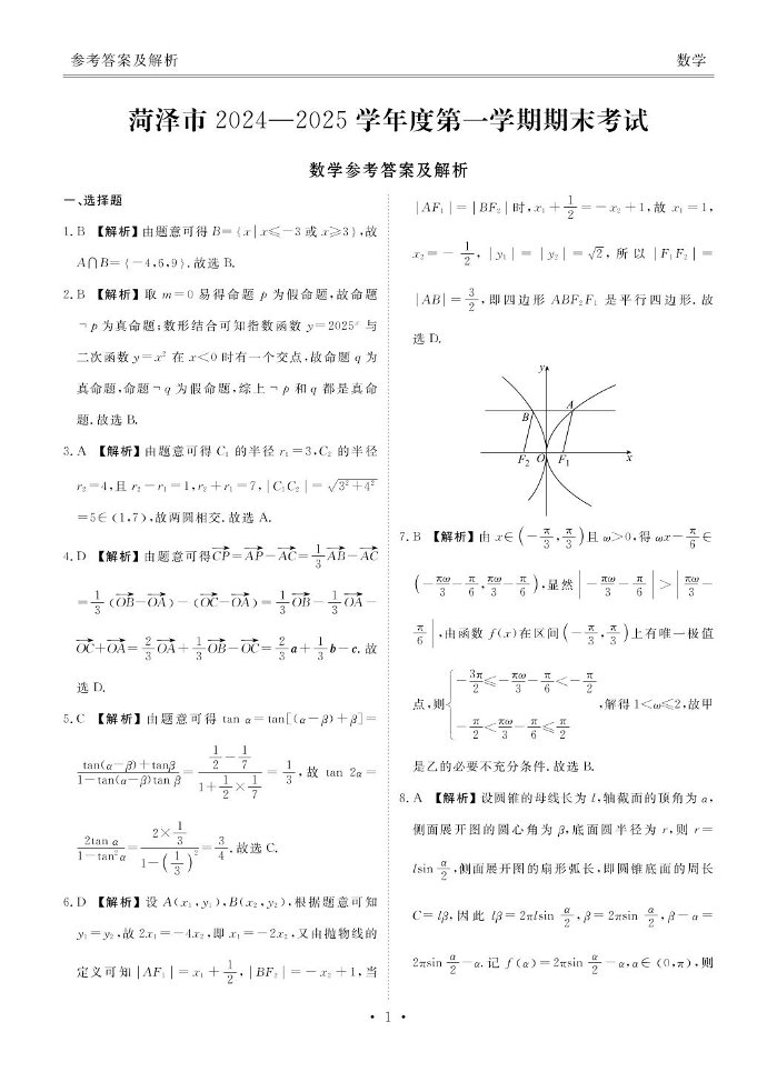 山东省菏泽市2024-2025学年上学期上学期1月高三期末考试数学答案