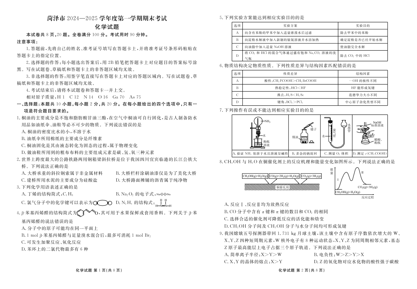 山东省菏泽市2024-2025学年上学期上学期1月高三期末考试化学+答案