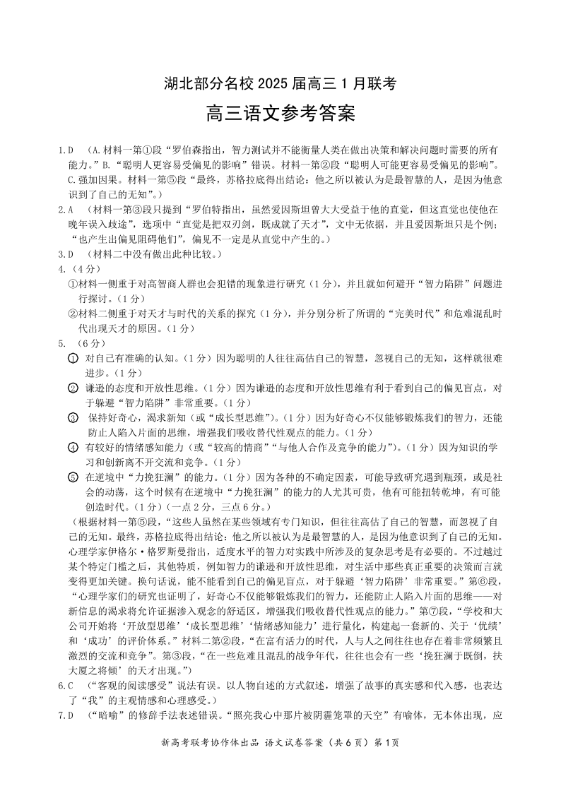 湖北省部分名校2024-2025 学年上学期1月高三期末联考语文答案