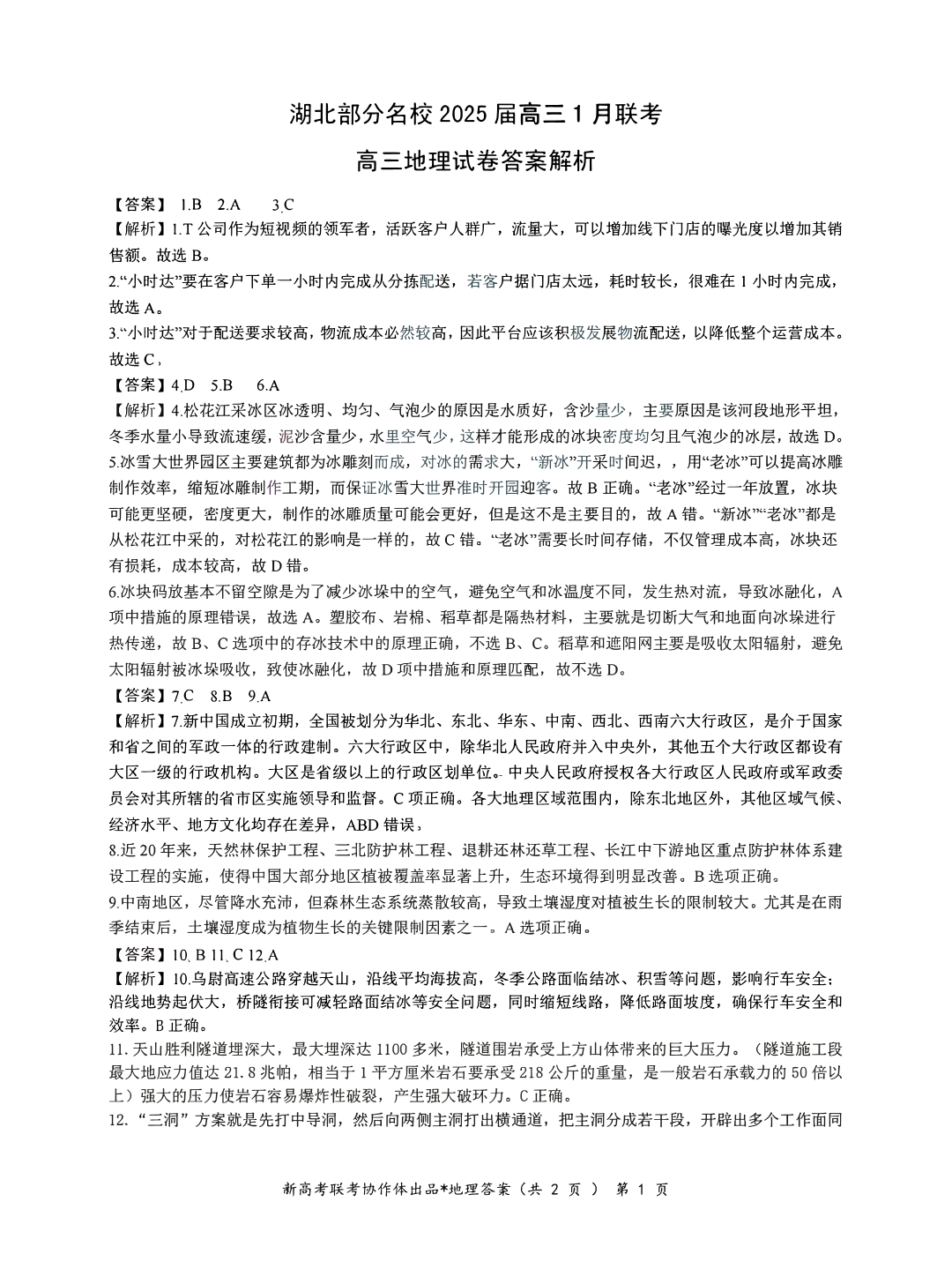 湖北省部分名校2024-2025 学年上学期1月高三期末联考地理答案