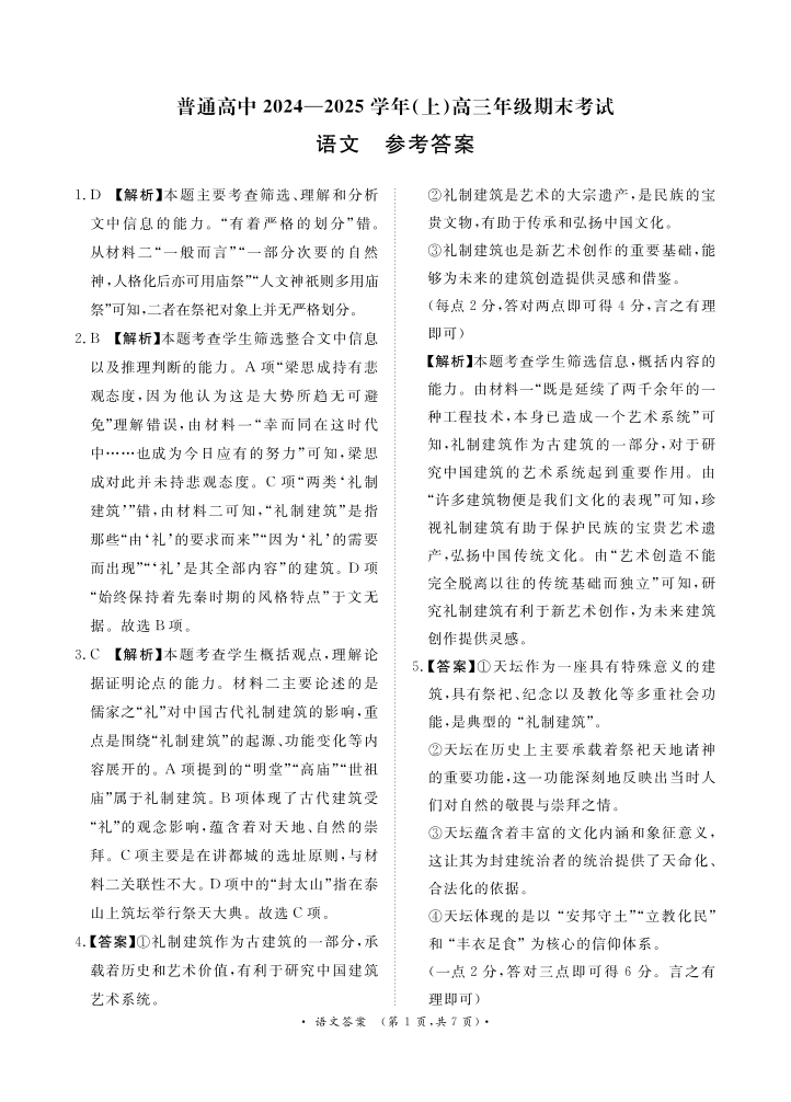 河南省区域高中2024-2025年上学期1月高三期末联考语文答案