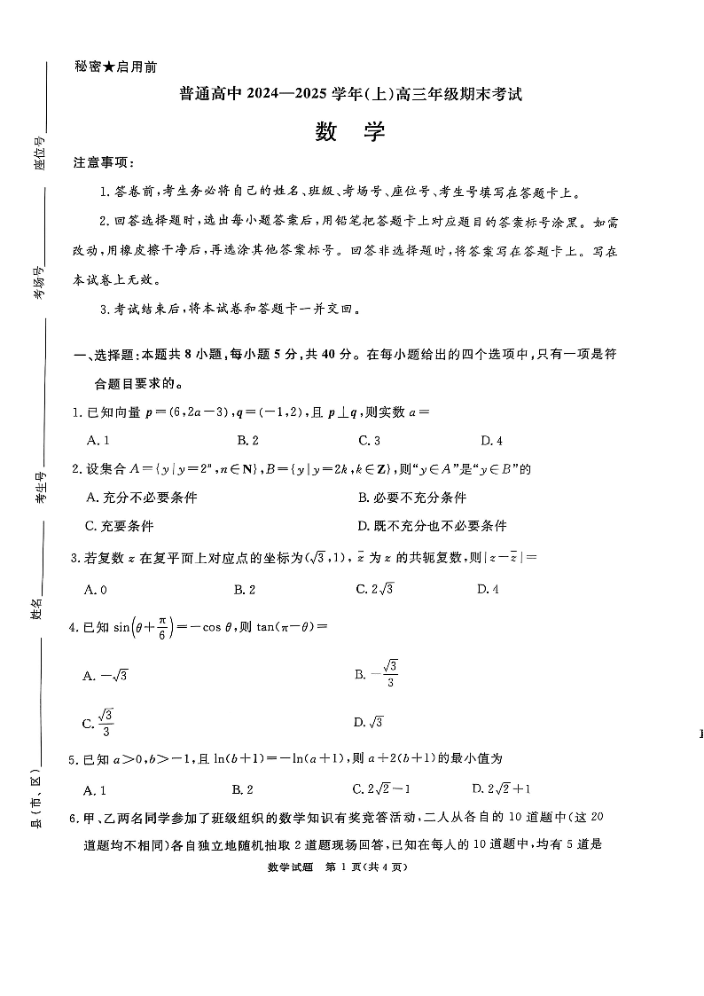 河南省区域高中2024-2025年上学期1月高三期末联考数学