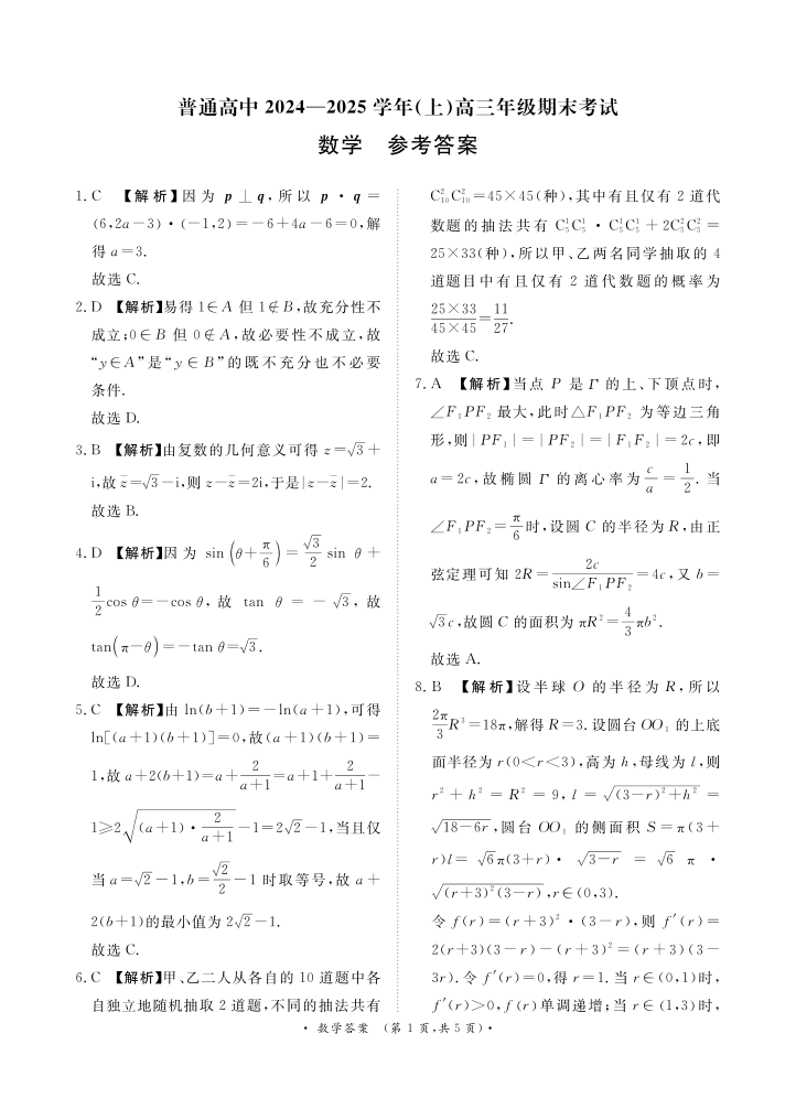 河南省区域高中2024-2025年上学期1月高三期末联考数学答案
