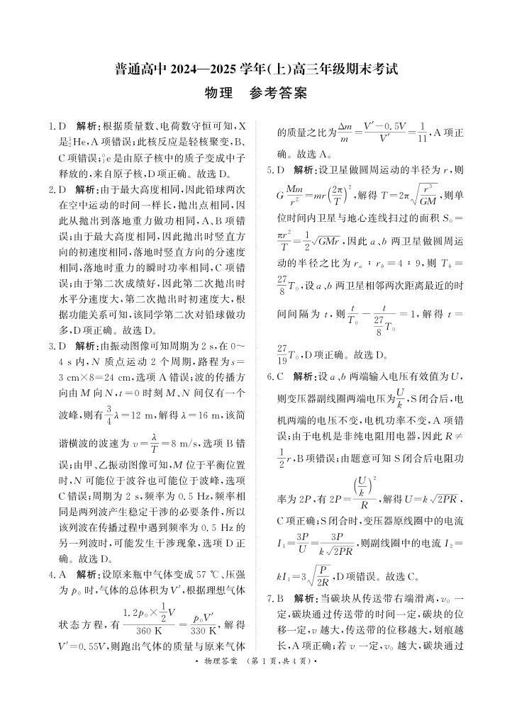 河南省区域高中2024-2025年上学期1月高三期末联考物理答案