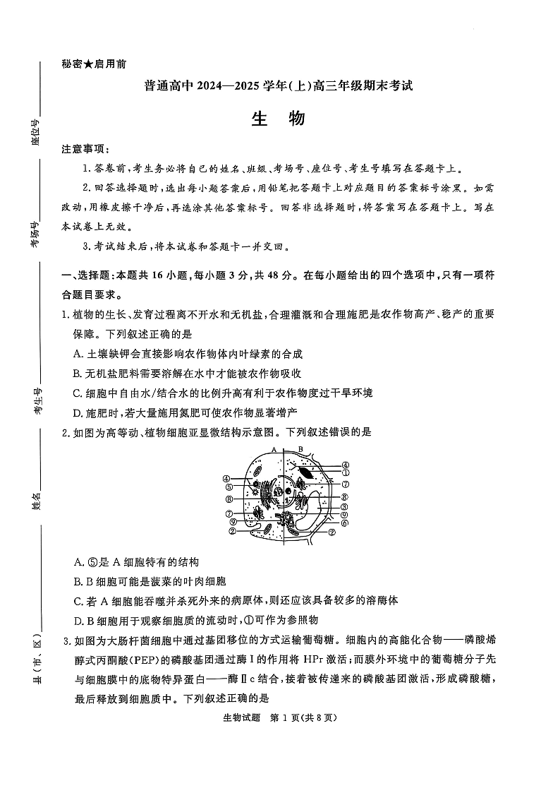 河南省区域高中2024-2025年上学期1月高三期末联考生物