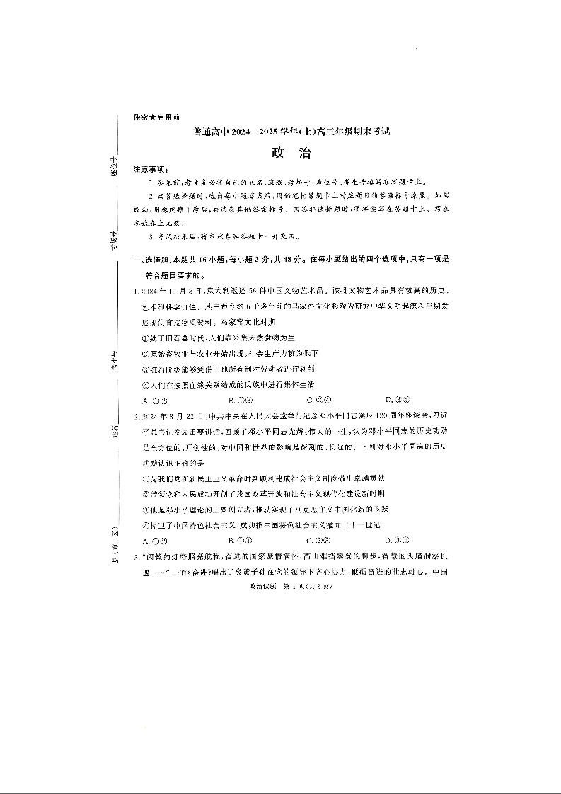 河南省区域高中2024-2025年上学期1月高三期末联考政治