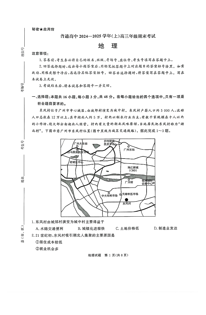 河南省区域高中2024-2025年上学期1月高三期末联考地理+答案