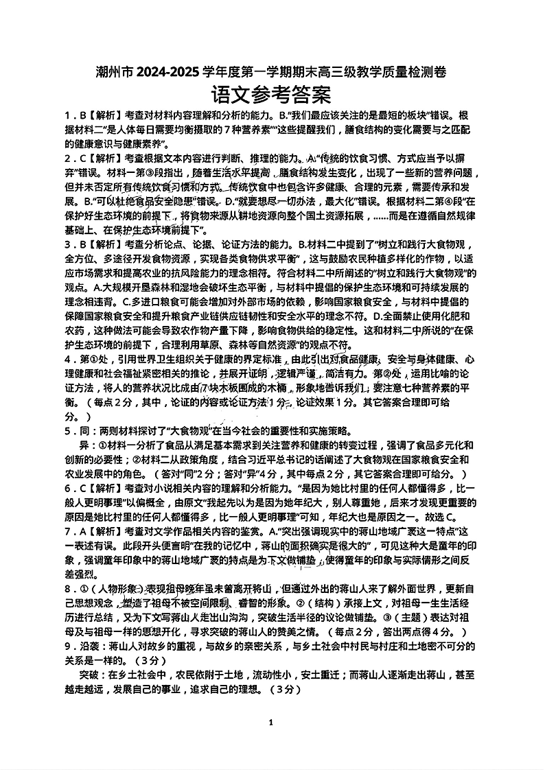 广东省潮州市20242025学年上学期1月高三期末教学质量检测语文答案
