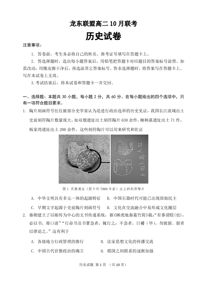 黑龙江省龙东联盟2023 级高二年级上学期 10 月月考历史
