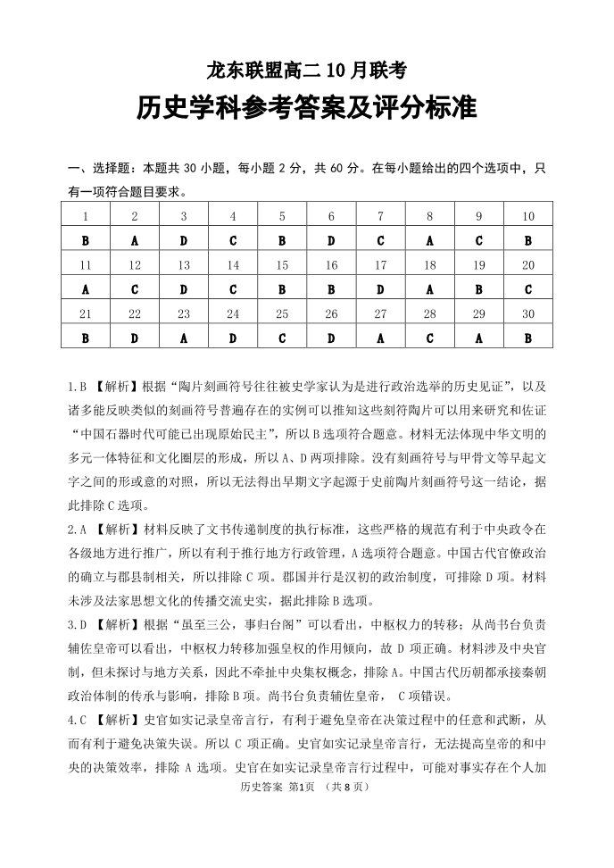黑龙江省龙东联盟2023 级高二年级上学期 10 月月考历史答案