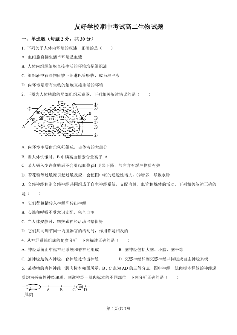 吉林省2024-2025学年度友好学校高二年级期中考卷生物(原卷版)