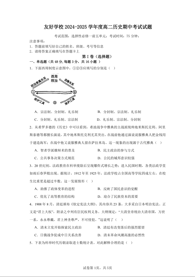 吉林省2024-2025学年度友好学校高二年级期中考卷历史