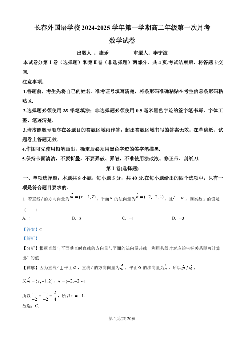 吉林省长春市朝阳区长春外国语学校2024-2025学年第一学期第一次月考数学(解析版)