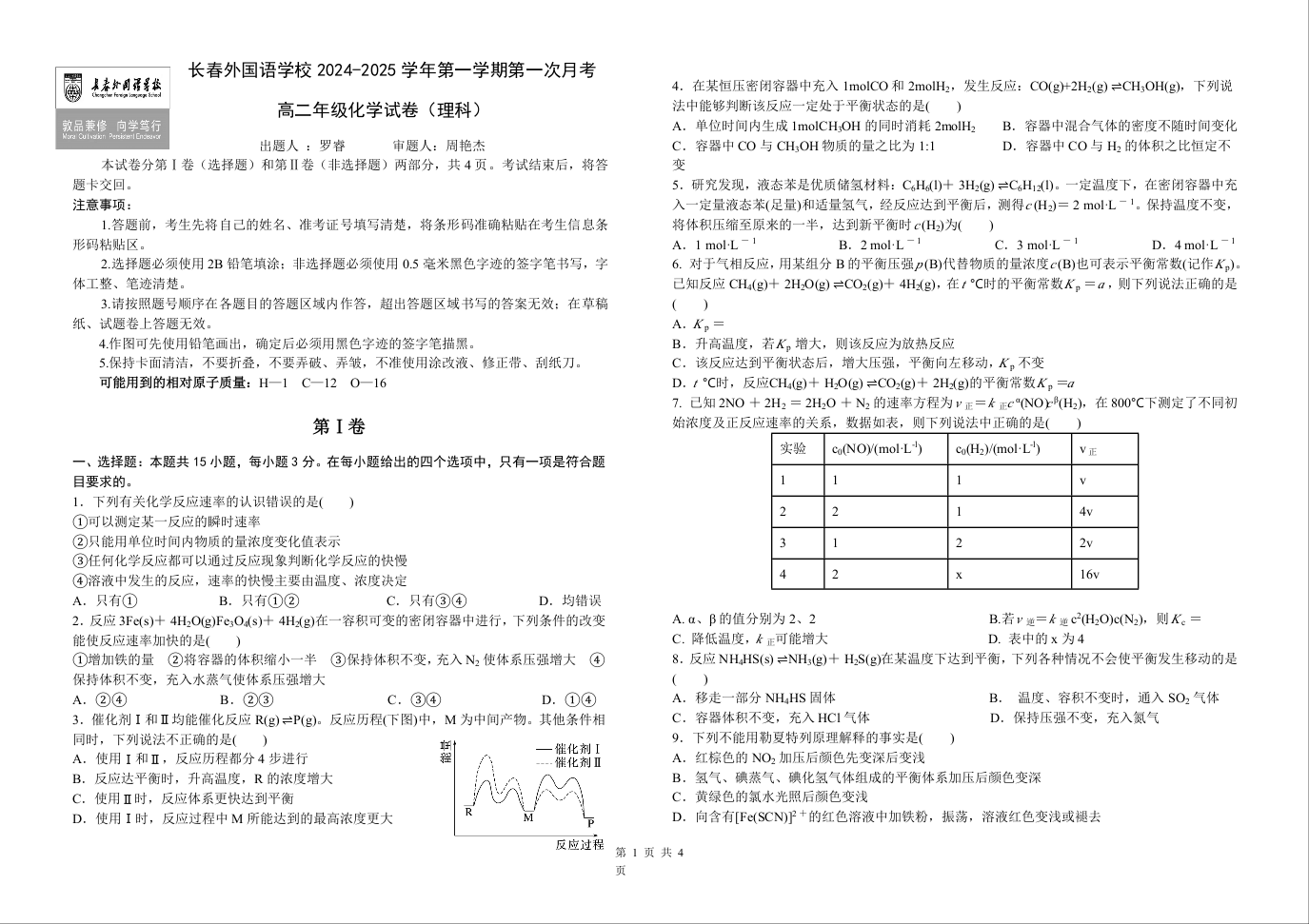 吉林省长春市朝阳区长春外国语学校2024-2025学年第一学期第一次月考化学+答案