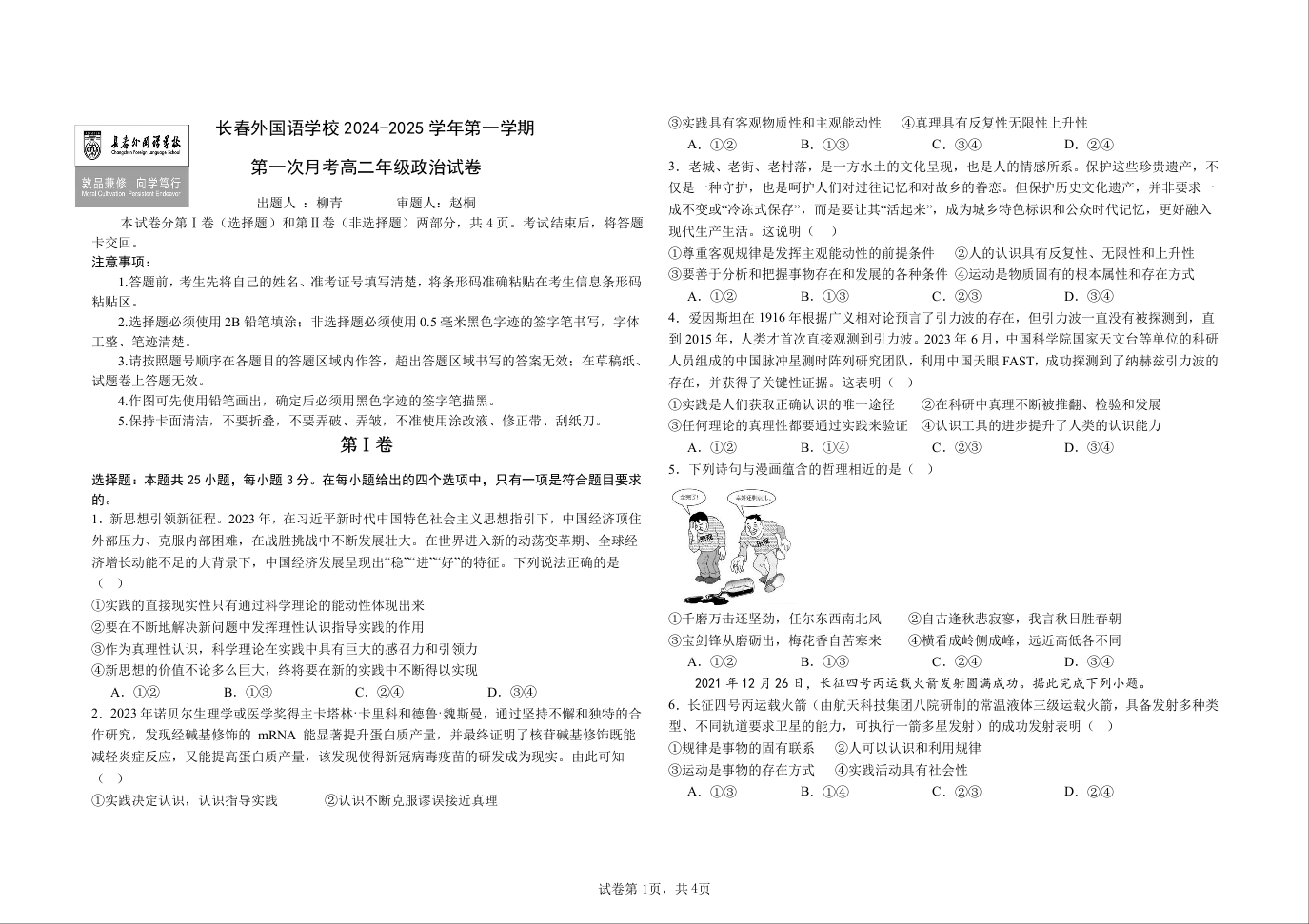 吉林省长春市朝阳区长春外国语学校2024-2025学年第一学期第一次月考政治+答案