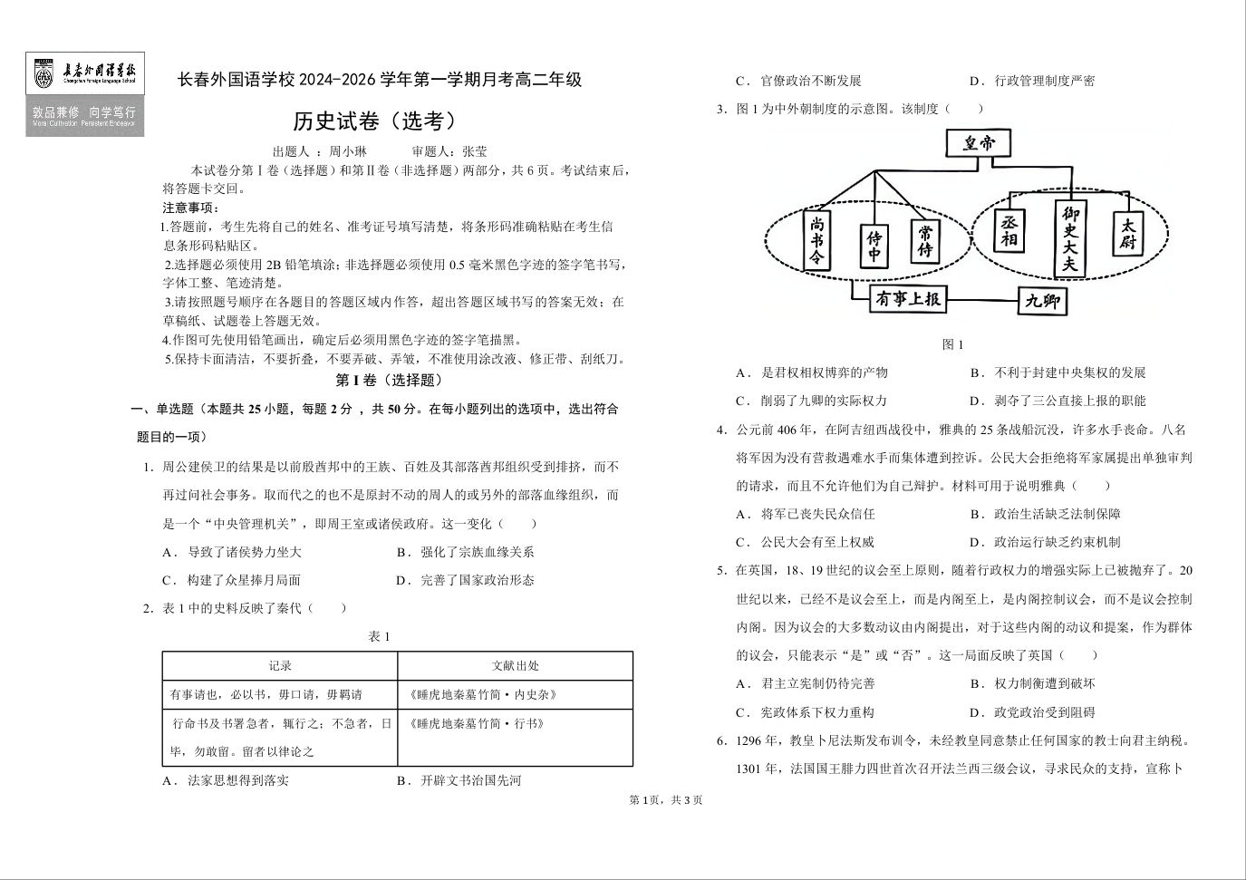 吉林省长春市朝阳区长春外国语学校2024-2025学年第一学期第一次月考历史+答案