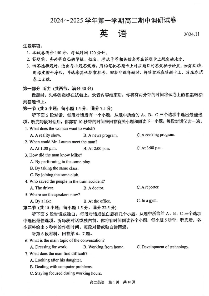 江苏省苏州市2024-2025学年第一学期高二期中调研英语