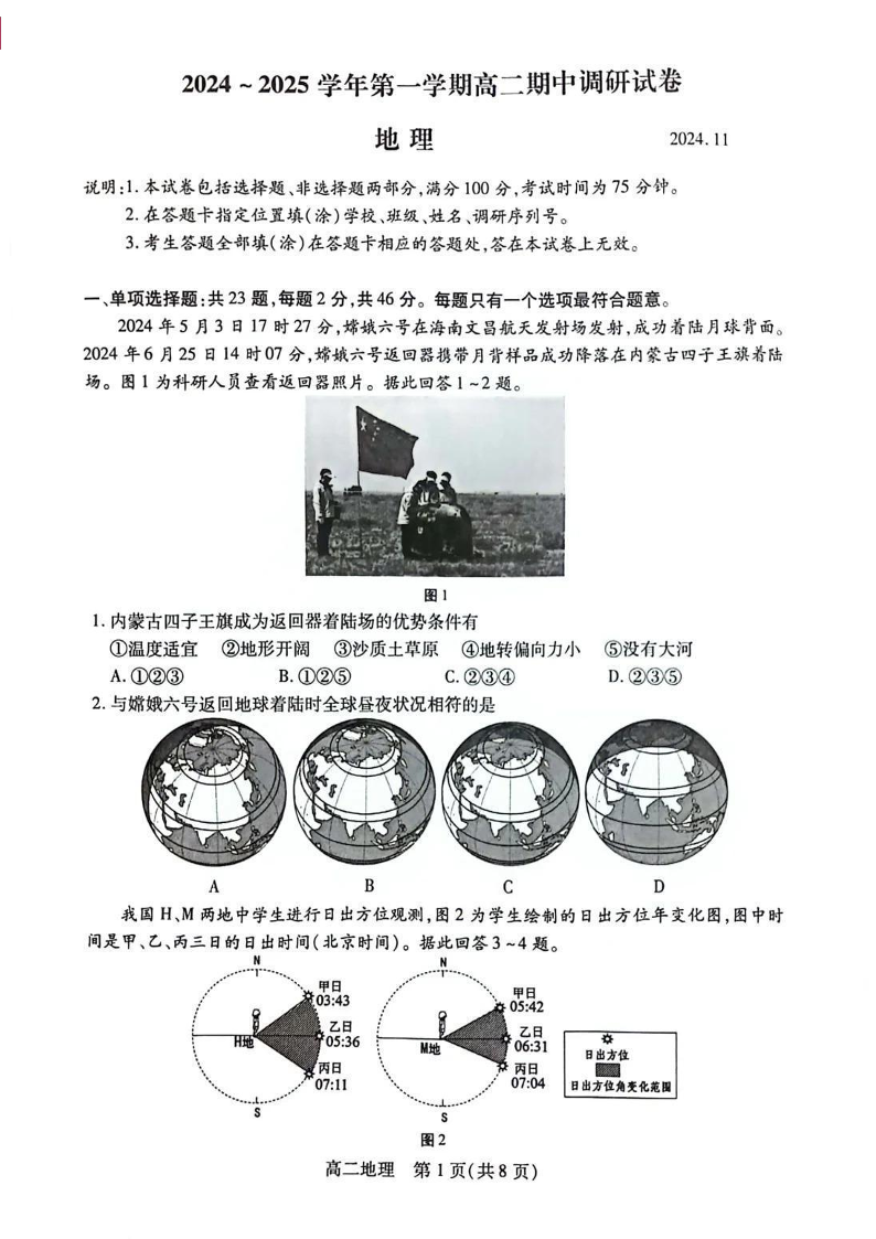 江苏省苏州市2024-2025学年第一学期高二期中调研地理