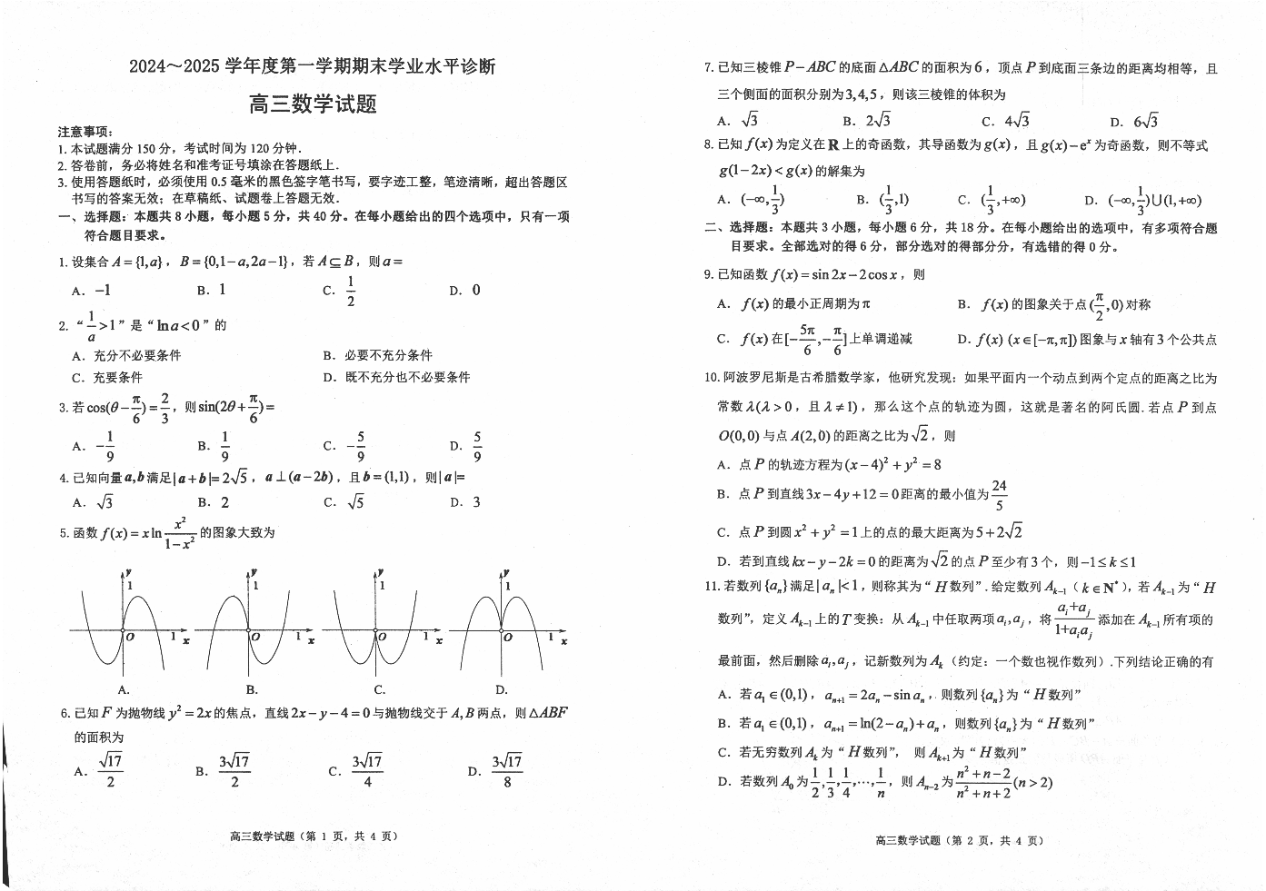 山东省威海市2024-2025学年第一学期1月高三期末学业水平诊断数学