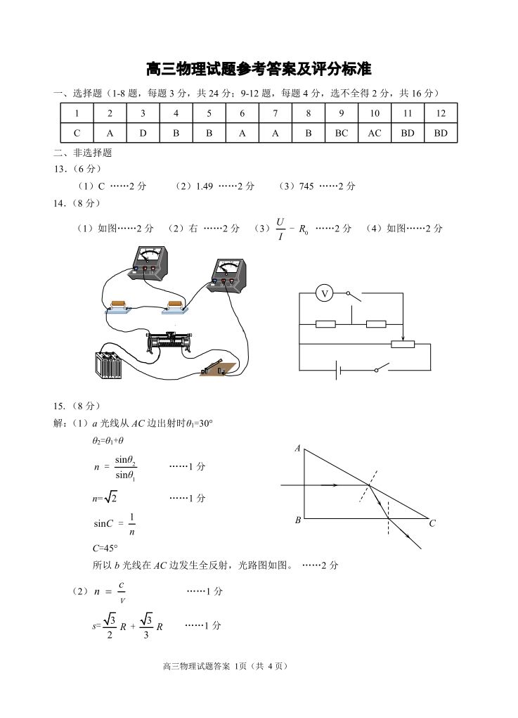 山东省威海市2024-2025学年第一学期1月高三期末学业水平诊断物理答案