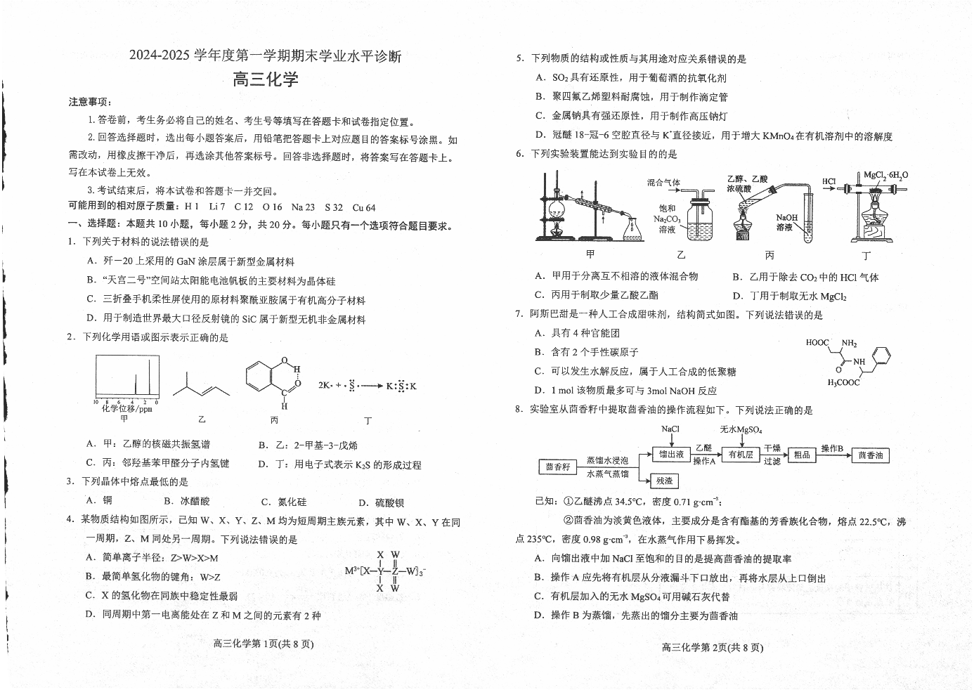 山东省威海市2024-2025学年第一学期1月高三期末学业水平诊断化学