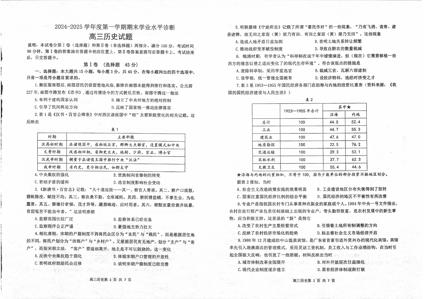 山东省威海市2024-2025学年第一学期1月高三期末学业水平诊断历史