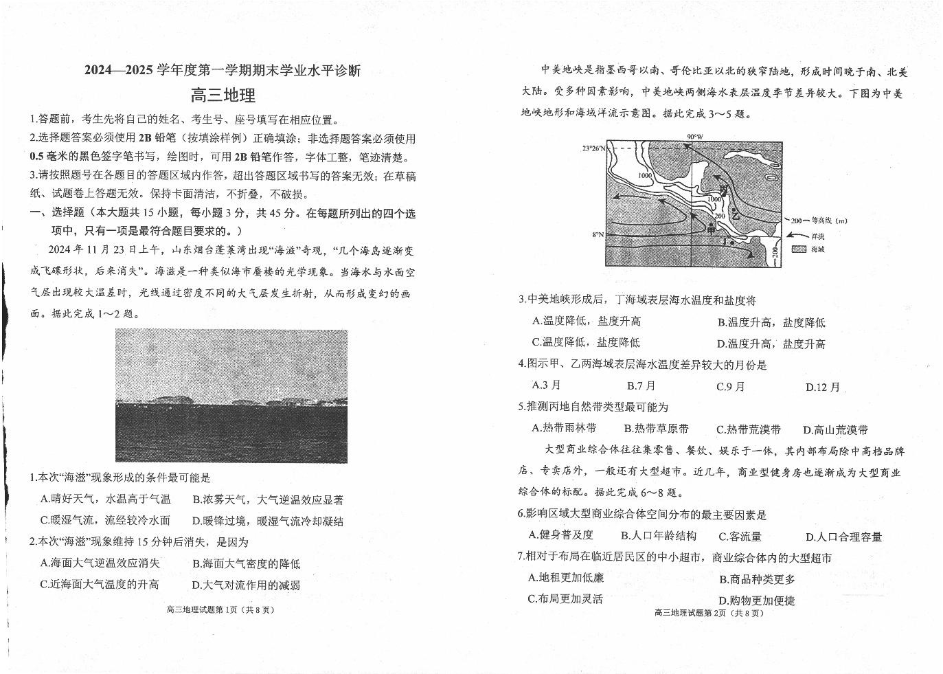 山东省威海市2024-2025学年第一学期1月高三期末学业水平诊断地理